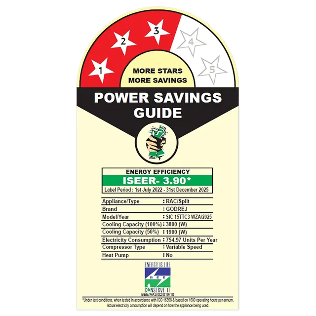 | Specification | General Information Air Conditioner Type: Split Capacity: 1.2 Ton Coverage Area: Up to 150 Sq. Ft. Model Series: SIC 15TTC3 Model Number: 40101701SD01651 Brand: Godrej Color: White Dimensions & Weight Indoor Unit (Main Unit) Dimensions (W x D x H): 84.90 x 21.00 x 28.90 cm / 33.43 x 8.27 x 11.38 in Weight: 9.8 kg Outdoor Unit Dimensions (W x D x H): 78.00 x 32.00 x 54.50 cm / 30.71 x 12.60 x 21.46 in Weight: 21.8 kg Packaged Outdoor Unit Dimensions (W x D x H): 82.40 x 34.60 x 56.70 cm / 32.44 x 13.62 x 22.32 in Weight: 26 kg Features Convertible Mode Inverter Technology I-Sense Technology Anti-Freeze Thermostat Silent Operation Hygiene+ Self-Clean Performance Cooling Capacity: 3800 Watts Compressor Type: Rotary Refrigerant Type: R32 Condenser Coil Type: Copper Louver Swing: Up/Down Other Body Features: Evaporator Coils & Connecting Tube Energy & Power Star Rating: 3 Star ISEER (Indian Seasonal Energy Efficiency Ratio): 3.9 Power Consumption: 755 Watts Voltage Rating: 230 V Frequency: 50 Hz Materials & Durability Build Quality: Copper condenser for durability Finish: White |