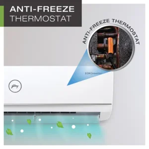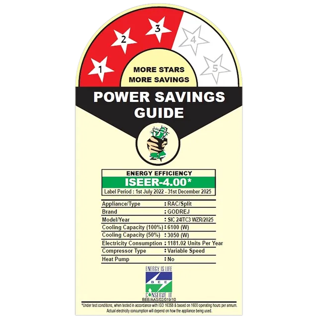 | Specification | General Information Item Code: 581110300 Brand: Godrej Model: 24ITC3-W Air Conditioner Type: Split Colour: White Approx. Room Size: 151 – 200 sq.ft. Performance & Operations Tonnage: 2 Ton Cooling Capacity: 6050 Watts Inverter Technology: Yes ISEER Value: 3.9 Condenser Coil: Copper Refrigerant Type: R32 Noise Level: 57 dB Speed Settings: 3 Speed Filter Type: Anti-Dust Filter Auto Air Swing: Yes (Horizontal Auto Swing) Auto Clean Function: Yes Physical Dimensions & Weight Indoor Unit (Main Unit) Width: 100 cm Depth: 23 cm Height: 29.5 cm Weight: 11 kg Outdoor Unit Width: — Depth: 31.2 cm Height: 59.2 cm Weight: 28 kg Certificates & Ratings BEE Star Rating: 3 Star Disclaimer: Ratings are valid for a specific duration of time and may undergo revisions. Power Details Power Consumption: 1955 Watts Additional Features Smart Diagnosis Hidden Display in IDU Acoustic Jacket on Compressor Horizontal Auto Air Swing |