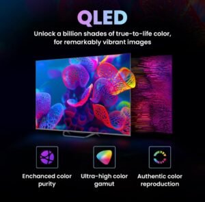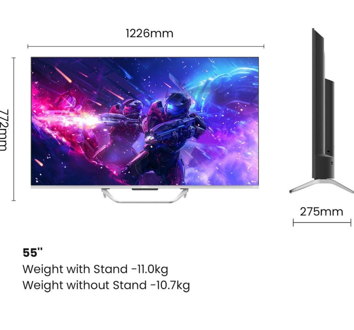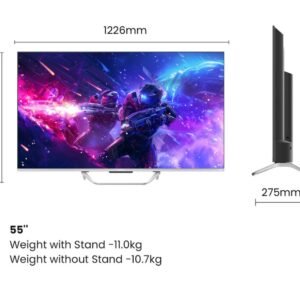 | Specification | 📺 Display Display Size: 139 cm (55 inch) Resolution: Ultra HD (4K) (3840 x 2160) Display Technology: QLED LED Arrangement: DLED Refresh Rate: 60 Hz Motion Enhancement: MEMC (Motion Estimation, Motion Compensation) Viewing Angle: 178° Brightness: 320 nits Aspect Ratio: 16:09 Color Technology: Wide Color Gamut 🔊 Audio Speaker Output (RMS): 30W Speaker System: 2 speakers Sound Technologies: Dolby Digital Surround Sound Digital Noise Filter Sound Modes: Supported Audio Formats: MP3, AAC Digital Audio Output: 1 🔌 Connectivity HDMI Ports: 4 USB Ports: 2 Headphone Jack: 1 Casting Support: Mobile, Laptop, PC Supported Video Formats: MP3, MP4 🧠 Smart TV Features Operating System: Google TV 14 Smart TV: Yes RAM: 2 GB Storage: 32 GB Graphic Processor: ARM Mali G52 Supported Apps: Picture Modes: Zoom Options: Parental Controls: Yes System Language: English 📐 Dimensions & Weight Power Supply: 100–240V AC, 50–60 Hz Power Consumption: 179.58 W (Max), 0.5 W (Standby) BEE Star Rating: 3 Star Other Power Features: Power Saving Mode 🎁 In the Box 1 x LED TV 1 x Remote Control 2 x AAA Batteries 1 x Tabletop Stand 1 x User Manual 1 x Warranty Card 🛡️ Warranty Standard manufacturer warranty (exact details subject to seller/region) ℹ️ General Info Model Name: 55H6E Series: H6E Smart TV: Yes Color: Grey Launch Year: 2025 |
