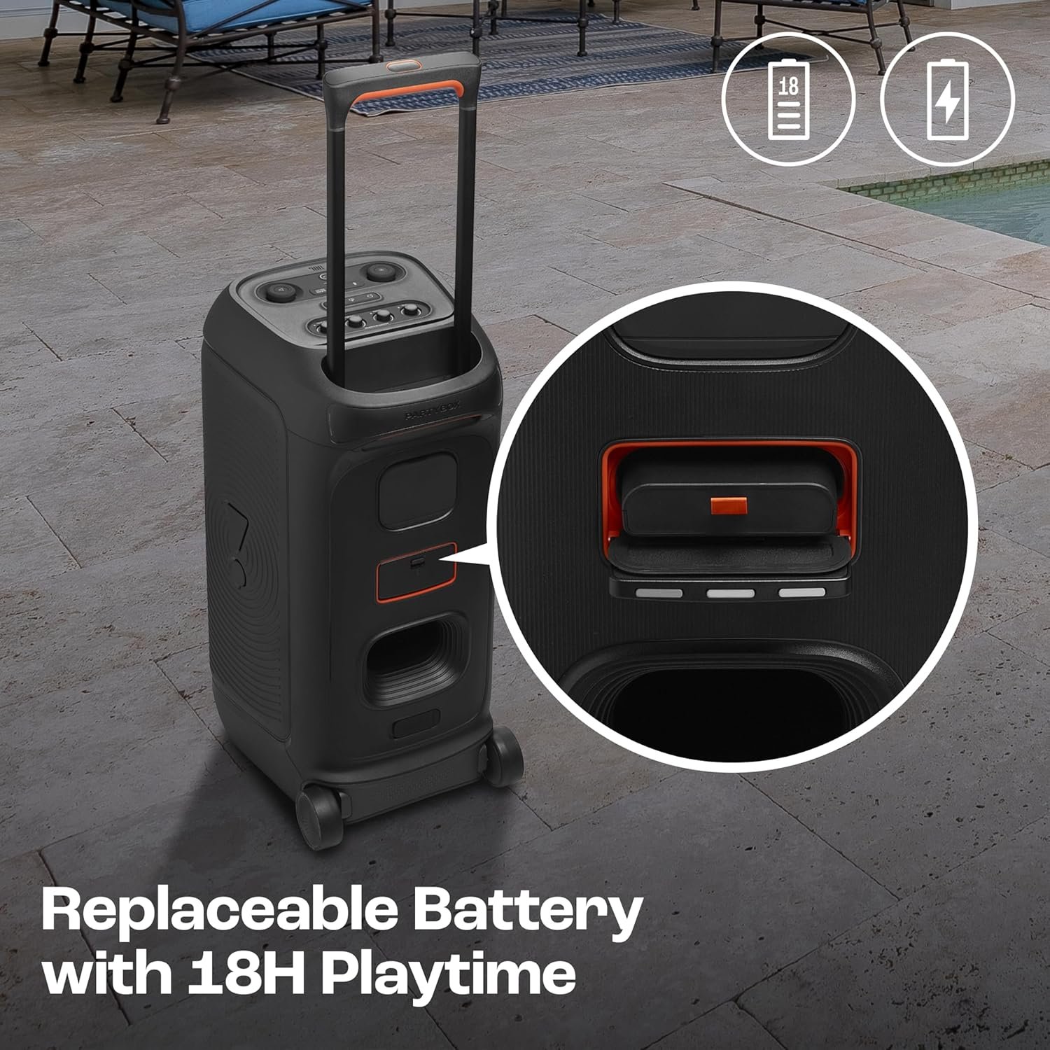 | Specification | General Sales Package: 1 Speaker, Quick Start Guide, Warranty Card, Safety Sheet Model Number: PBSTAGE320IN Model Name: PartyBox 320 (AI Sound Boost, Futuristic Light Show, Up to 18Hrs Playtime) Type: Party Speaker Color: Black Configuration: Mono Power Source: Built-in Rechargeable Battery Power Output (RMS): 240 W Bluetooth: Yes Wired/Wireless: Wireless Outdoor Usage: Yes Dimensions Width: 33.5 cm Height: 66.9 cm Depth: 38.5 cm Controls Play, Pause, Volume, Bluetooth Pairing, Power |