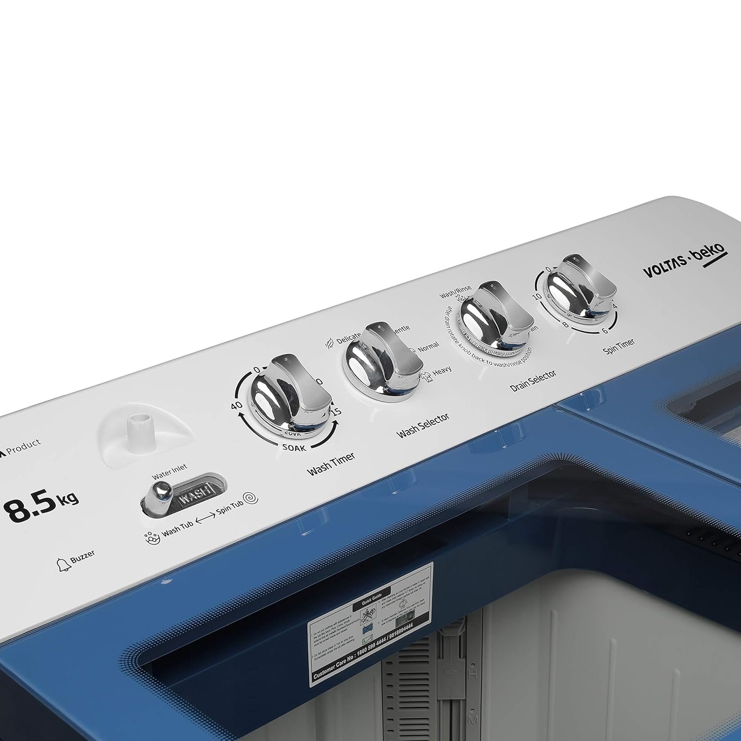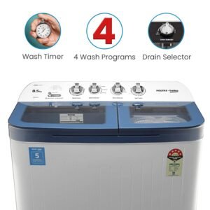 | Specification | General Features Brand: Voltas Beko Model Name: WTT75UHA/OK5S1S1W01 Function Type: Semi-Automatic Top Load Washing Capacity: 7.5 kg Washing Method: Pulsator Maximum Spin Speed: 1350 RPM In-built Heater: No Steam Wash: No Energy Rating: 5 Star Color: Grey & White Shade: Grey Wi-Fi Connectivity: No Delay Start: No Rat Mesh: No Mini – In-built Heater: No Body & Design Features Body Material: Durable Plastic (Standard for segment) Lid Type: Opaque (not specified as transparent) Finish: Modern grey and white dual-tone Convenience Features Digital Display: No Control Type: Manual Knobs Power Features Power Consumption: 230 W Power Requirement: AC 230–240 V, 50 Hz Dimensions & Weight Width: 80.5 cm Height: 99 cm Depth: 47.5 cm Weight: 21 kg |