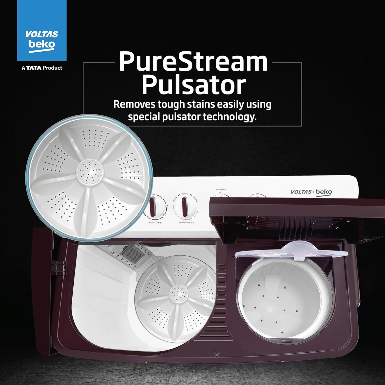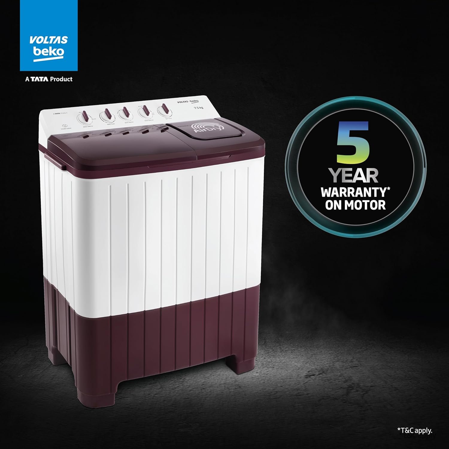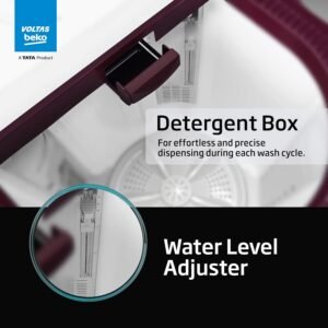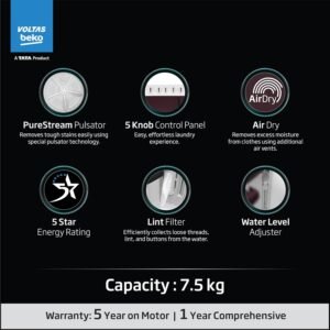 | Specification | General Features Brand: Voltas Beko Model Name: WTT75UHA/OK5S1S1W01 Function Type: Semi-Automatic Top Load Washing Capacity: 7.5 kg Washing Method: Pulsator Maximum Spin Speed: 1350 RPM In-built Heater: No Steam Wash: No Energy Rating: 5 Star Color: Grey & White Shade: Grey Wi-Fi Connectivity: No Delay Start: No Rat Mesh: No Mini – In-built Heater: No Body & Design Features Body Material: Durable Plastic (Standard for segment) Lid Type: Opaque (not specified as transparent) Finish: Modern grey and white dual-tone Convenience Features Digital Display: No Control Type: Manual Knobs Power Features Power Consumption: 230 W Power Requirement: AC 230–240 V, 50 Hz Dimensions & Weight Width: 80.5 cm Height: 99 cm Depth: 47.5 cm Weight: 21 kg |