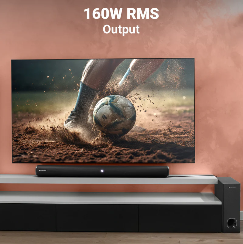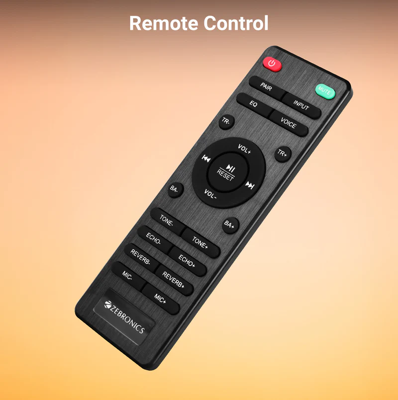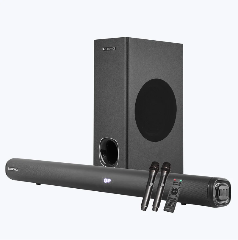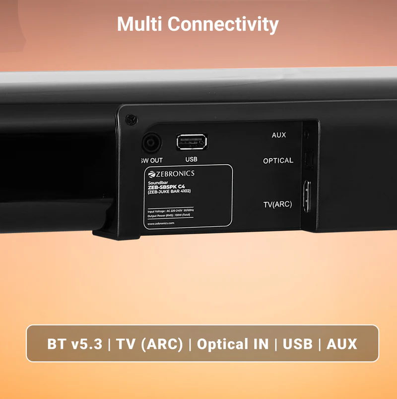 | Specification | Model Name: ZEB-SBSPK C4 Output Power (RMS): Subwoofer: 90W Soundbar: 35W × 2 Total: 160W Driver Size: Subwoofer: 13.33 cm × 1 Soundbar: 6.35 cm × 2 Impedance: Subwoofer: 4Ω Soundbar: 8Ω Frequency Response: 45Hz – 20kHz File Format Support (USB): MP3 Bluetooth: Name: ZEB-JUKE BAR 4102 Version: v5.3 Dimensions Subwoofer (W × D × H): 15 × 25 × 41 cm Soundbar (W × D × H): 86 × 8.5 × 7.7 cm Package (W × D × H): 46.2 × 20.2 × 92 cm Weight Subwoofer: 3.4 kg Soundbar: 1.75 kg Total Net Weight: 5.15 kg Country of Origin PRC Package Contents Soundbar × 1 Unit Subwoofer × 1 Unit Remote Control × 1 Unit Wireless Microphones × 2 Units Input Cable × 1 Unit Charging Cable × 1 Unit Wall Mount Fasteners × 1 Set QR Code Guide × 1 Unit |